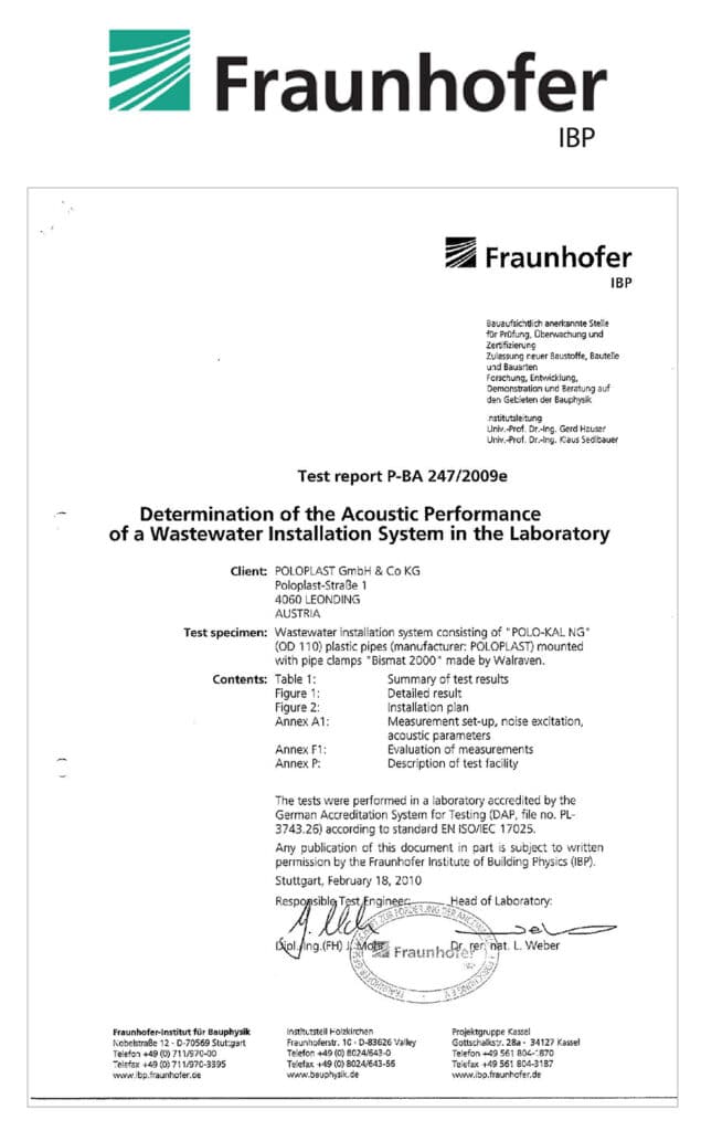 โดยท่อน้ำทิ้งเก็บเสียง PP ไซเลนท์ ผ่านการทดสอบ ระดับเสียงในการระบายน้ำจากสถาบัน Fraunhofer IBP ซึ่งเป็นผู้เชี่ยวชาญด้านการทดสอบผลทางกายภาพ ของวัสดุที่ใช้ในงานก่อสร้างอาคาร โดยเชี่ยวชาญด้าน Noise Control And Sound Insulation Measure ในอาคารการทดสอบทำโดยเข้มงวด แบบ Installation Sound Level (Lin) ในระบบ Closed Bracket